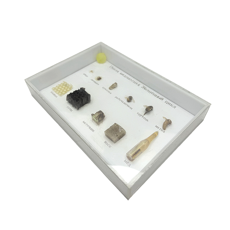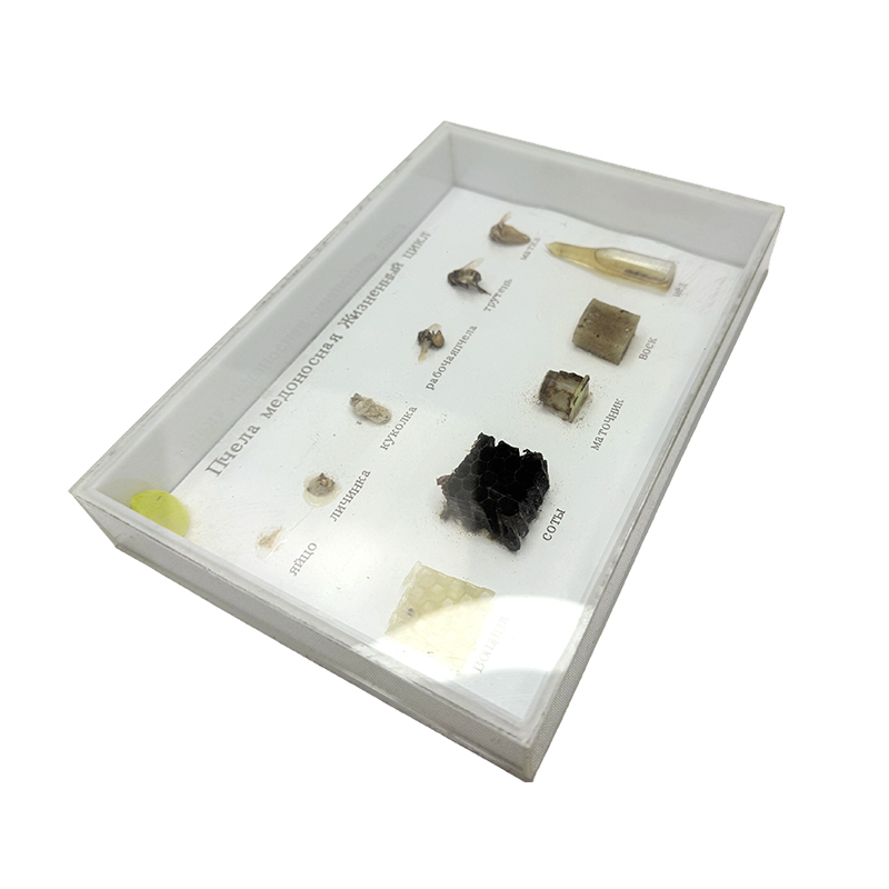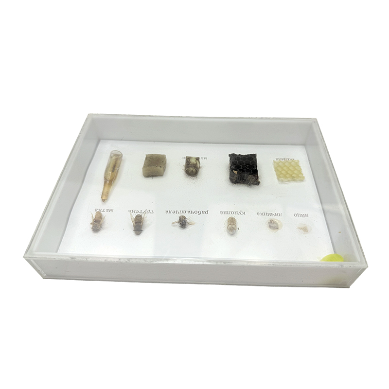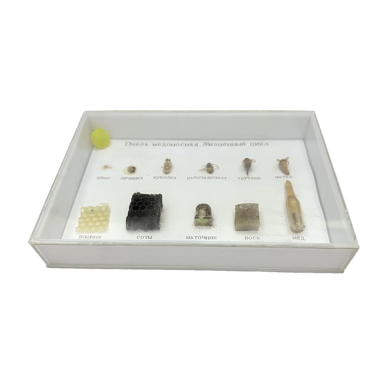 Los especímenes muestran la morfología de los huevos, pupas, cimientos de nidos, larvas, panales, abejas trabajadoras, panales, drones, cera de abejas, abejas queen y miel.