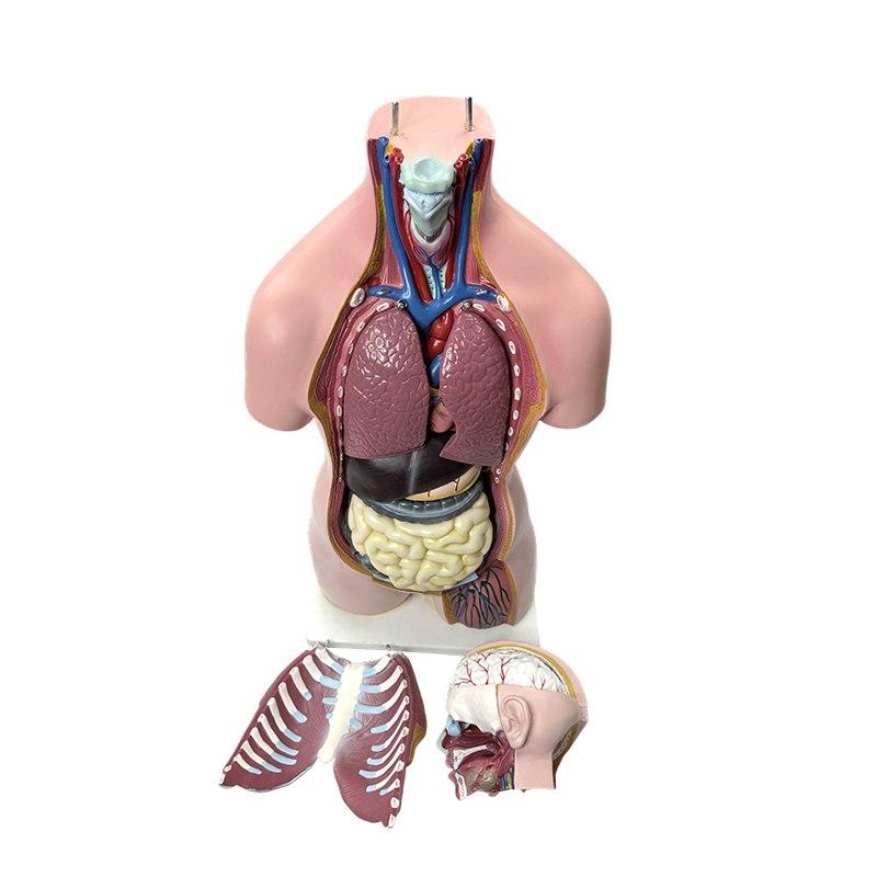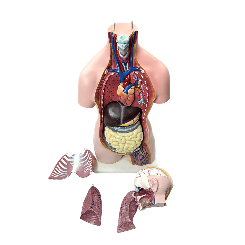 El modelo incluye el tronco, la cabeza, la cubierta del pecho femenino, el globo ocular, el nervio espinal del canal cerebral, el apéndice, el corazón, el riñón, el hígado, el estómago, el intestino, el pulmón, los genitales femeninos, los genitales masculinos y otras estructuras.