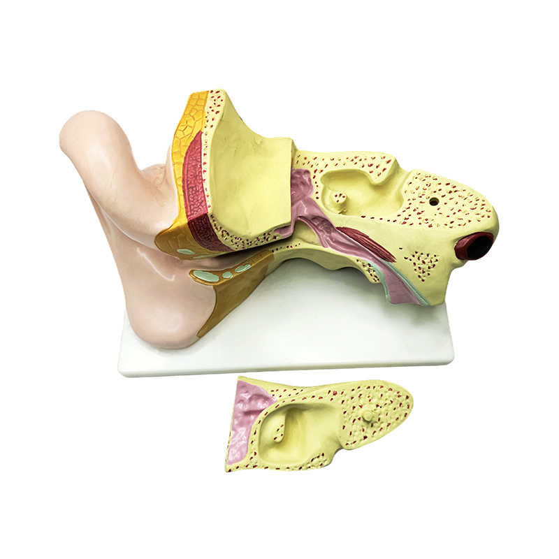 La parte frontal del canal auditivo externo se elimina para mostrar la estructura morfológica del canal auditivo externo. El hueso temporal se corta horizontalmente para mostrar la estructura morfológica del oído y el oído interno. El oído externo muestra: aurícula y canal auditivo externo. El oído medio muestra: membrana timpánica (removible), cavidad timpánica, tres osículos (extraíbles juntos), tubo eustaquio y cámara mastoidea. El oído interno (removible en su conjunto) muestra: tres canales óseos semicirculares, vestíbulos y cóclea, etc.