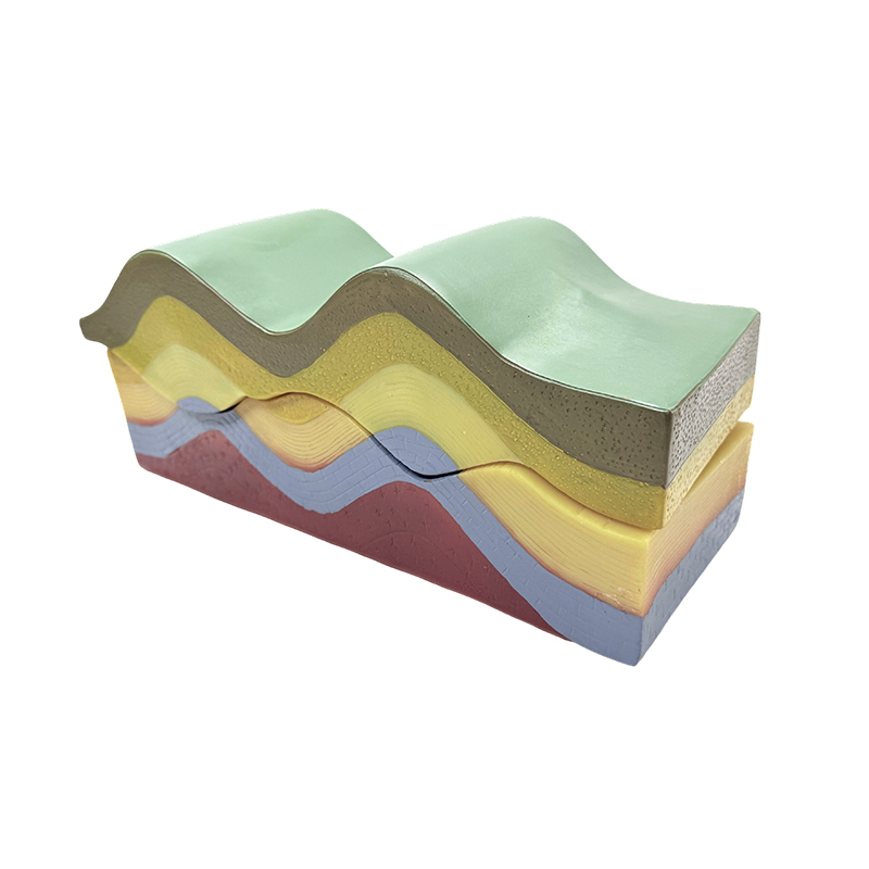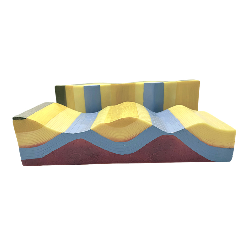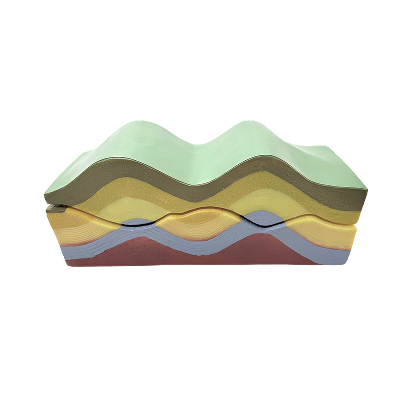 El modelo muestra la aparición inicial de capas de roca, las relaciones nuevas y antiguas entre las capas de roca horizontales y las capas de roca. Muestra que el terreno ha evolucionado durante un largo período de tiempo geológico. Se puede ver que la capa de roca está arrugada debido a la exprimción horizontal.
