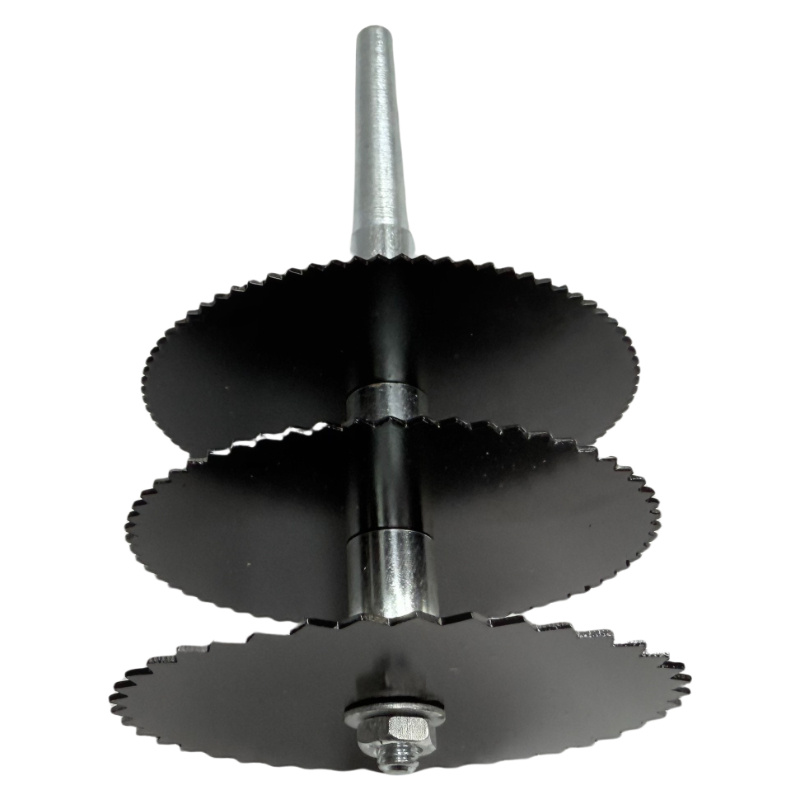3 engranajes de acero delgados, 40, 60 y 80 respectivamente, montados en un eje.