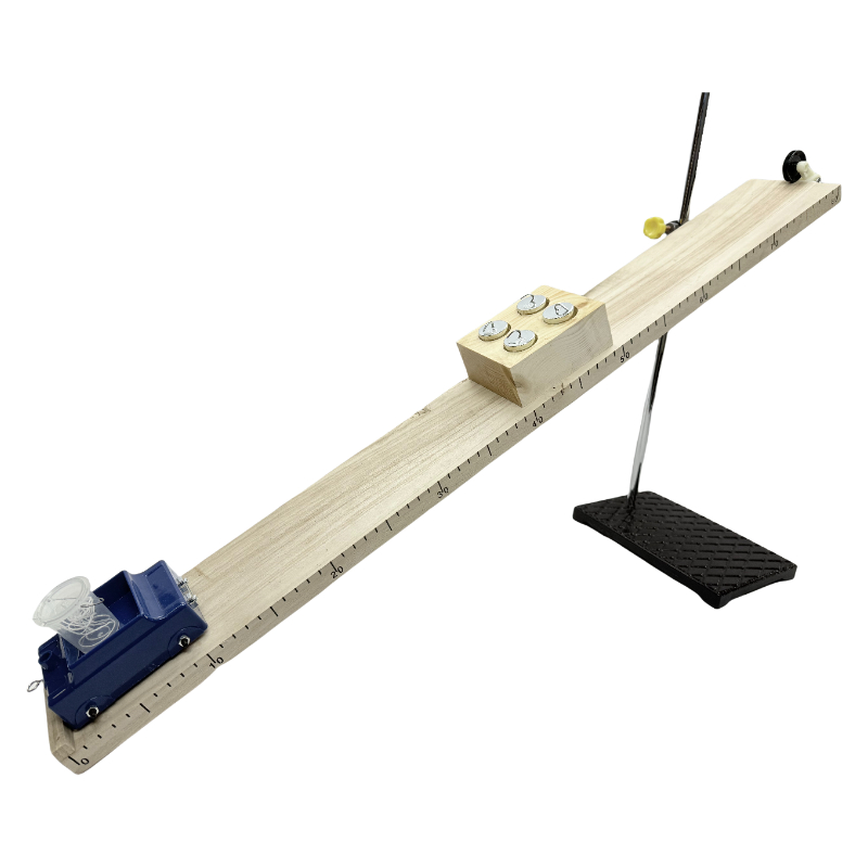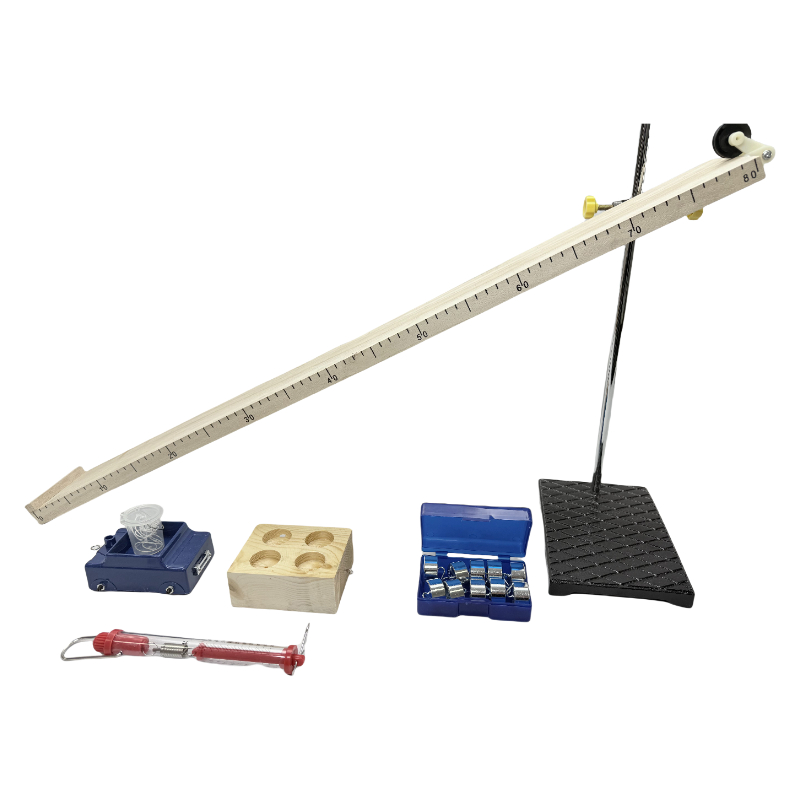 Escala de tablero de madera largo, carrito, soporte, gancho, dinamómetro, polea, bloque de madera de 4 hoyos, etc.