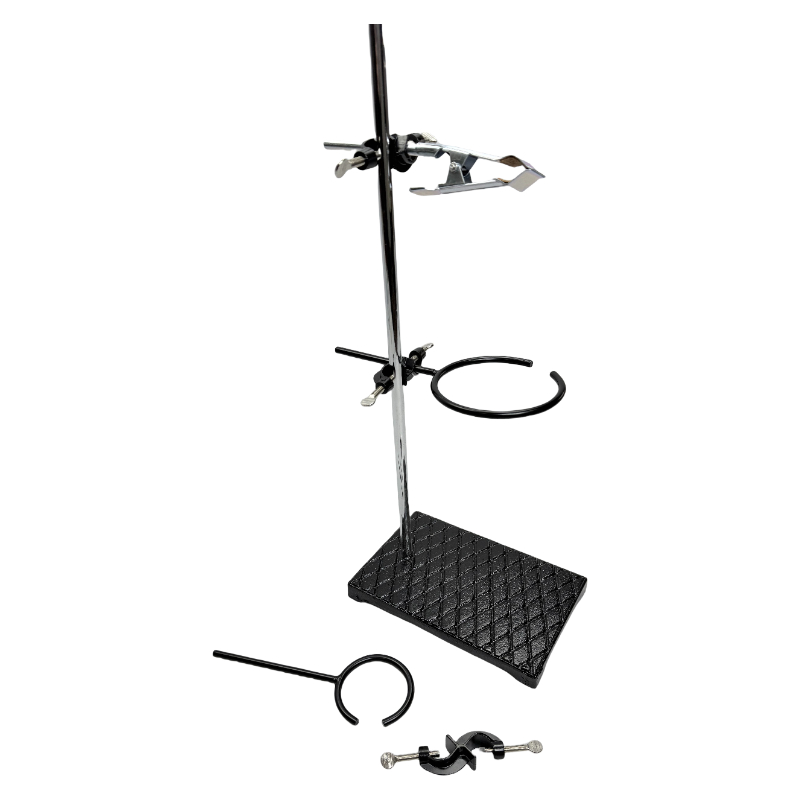 Base cuadrada, abrazadera paralela, abrazadera vertical, anillo de hierro grande, anillo de hierro pequeño, abrazadera de vaso de precipitados, poste vertical, etc.