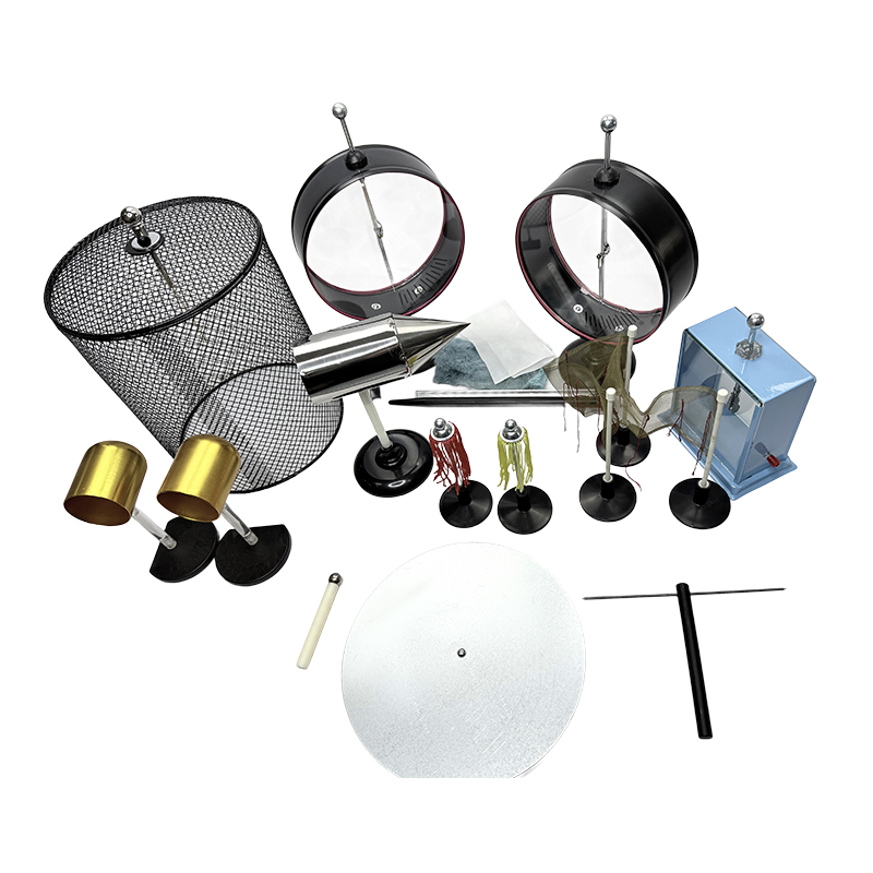 Copa Faraday, electroscopio de puntero, electroscopio de tela puntiagudo, electroscopio de aluminio, pluma de electroscopio, conductor de almohada, soporte giratorio, perdigonía de electroscopio, bola de electroscopio y varilla de electroscopio, condensador de placa paralela, varilla de vidrio y seda, palo de pegamento, etc.