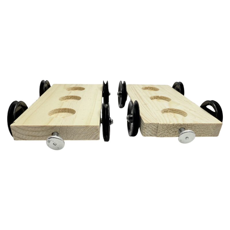 Bloque de madera con 3 hoyos, rueda de plástico, gancho, etc.